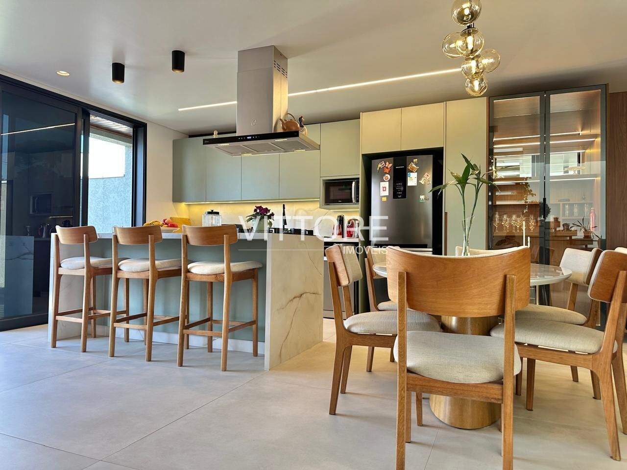 - Cozinha com moveis planejados e bancada com marmore, equipada com móveis planejados, cooktop, coifa, geladeira, forno, churrasqueira a gás;